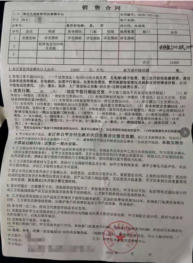 在2019.7.20日我们签订合同,在现场他们老板梁栋还答应我说给我加急说30-35天,具体时间要等他们的老板娘给回复,合同内容我当初是提出异议的(合同上写的是45天)他们设计师说这是他们固定的合同模板不能更改,而且他们老板都答应给我加急这些问题就自然不存在了,说真心话我们沟通都挺好,我也挺相信他们斑彩,所以我也就没多想就吧合同签订。交了全款。