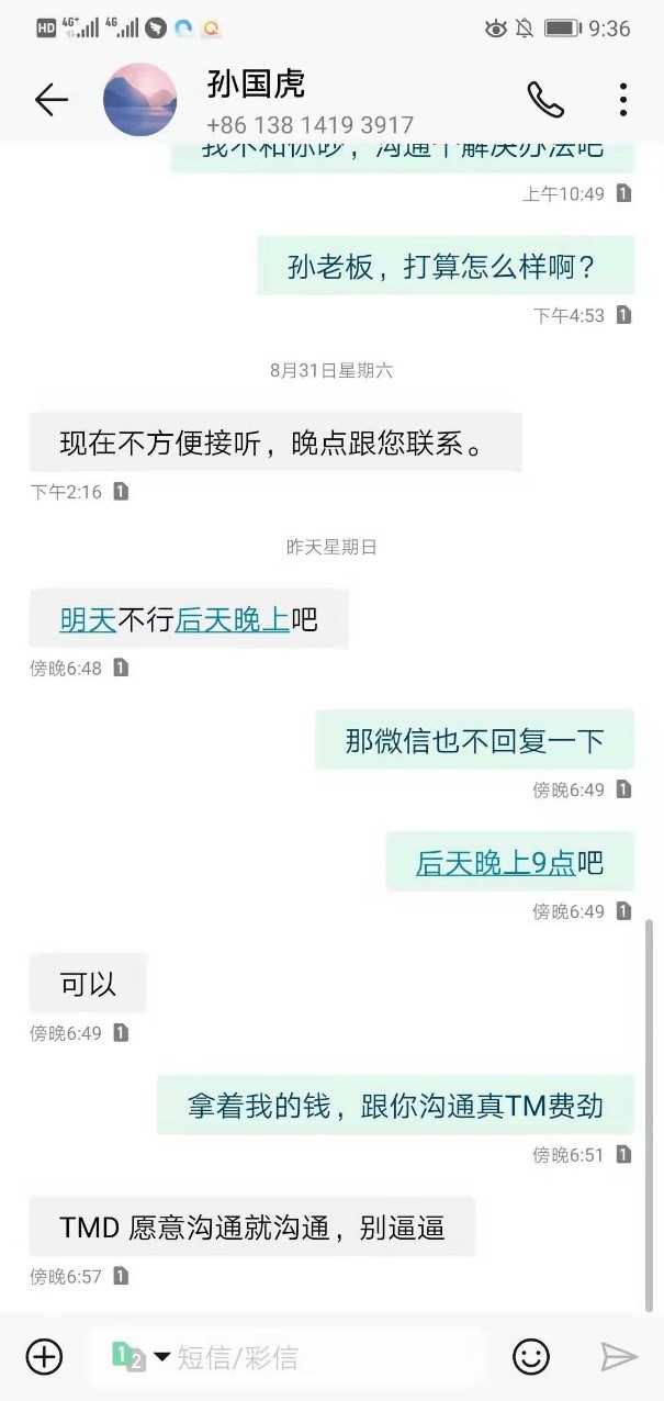 2019年7月18日,和南京伟禄的孙国虎签订装修合同,并交了预付款,工期到9月2日,不但毫无进展,且恶意拖工期,起诉至法院后,法院反馈无法送达起诉书,孙国虎电话告诉法院说他公司已经破产,在外地躲债。