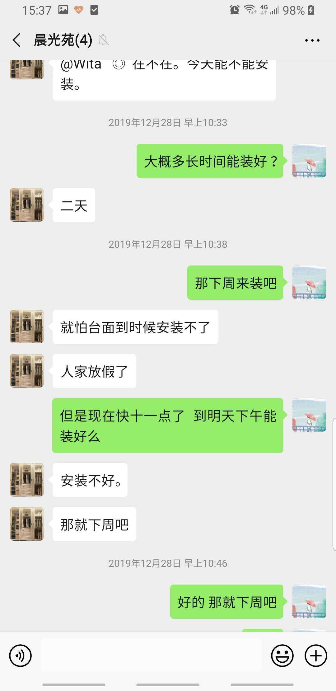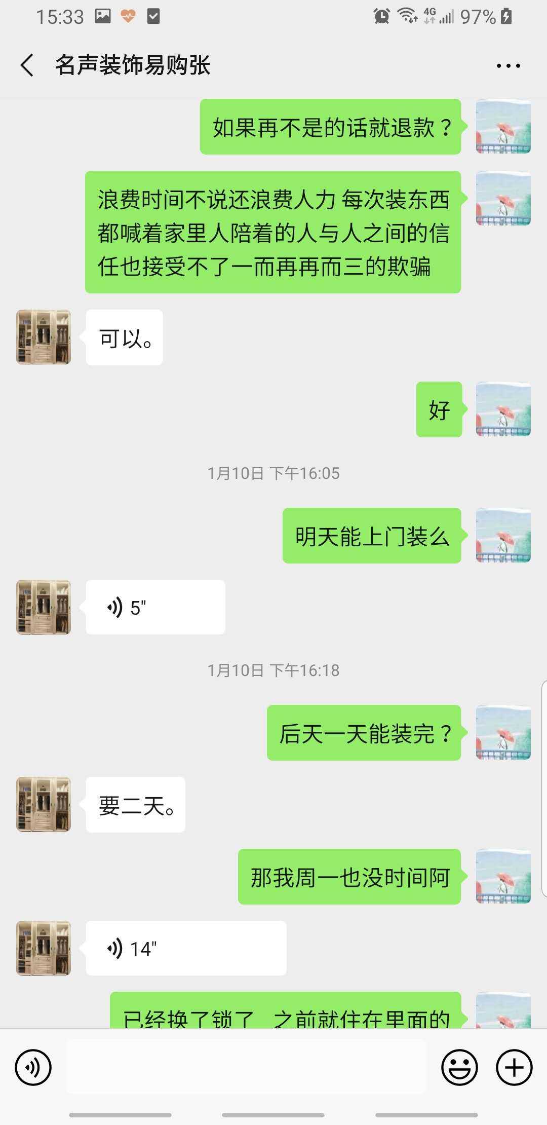一月四号 上门安装? ?发现板材不对? 不是兔宝宝? ?说拉回厂重新做? 承诺如果再不是兔宝宝板材就退款 承诺下周上门安装