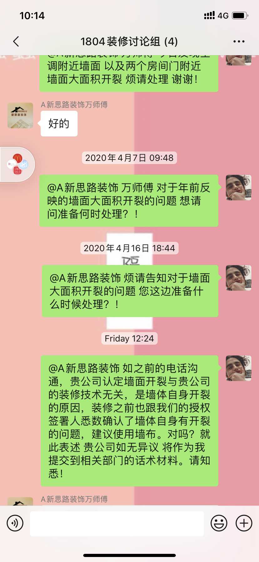本人的住宅给南京新思路装饰设计工程有限公司装修, 装修不满一年 室内墙面多处开裂!!!于2019年10月向南京新思路装饰设计工程有限公司公司反映,该公司负责人和我爸前去现场沟通,该公司认为是墙体自身开裂的问题,与该公司的装修技术无关,说后期修补也没用还是会开裂,要我们找开发商,因为过了维保期,开放商也不管,但就此问题 我只能找装修公司,因为房子在他手上装的,没有人会希望自己辛苦一辈子买的房子有裂缝,不管用什么办法都要把这墙填平!此后装修公司并无维修意图,又碰上疫情原因一直拖到现在,我认为春暖花开了是时候修补了,于是我微信联系该公司负责人,负责人毫不理会!态度恶劣!直到我打电话给他 他告诉我墙面修补了也没用还是会裂!直到我说我要到有关部门投诉该公司 他的微信才回复到 随便你吧!就此 我非常愤怒!该公司毫无契约精神!欺骗消费者!搞豆腐渣工程!