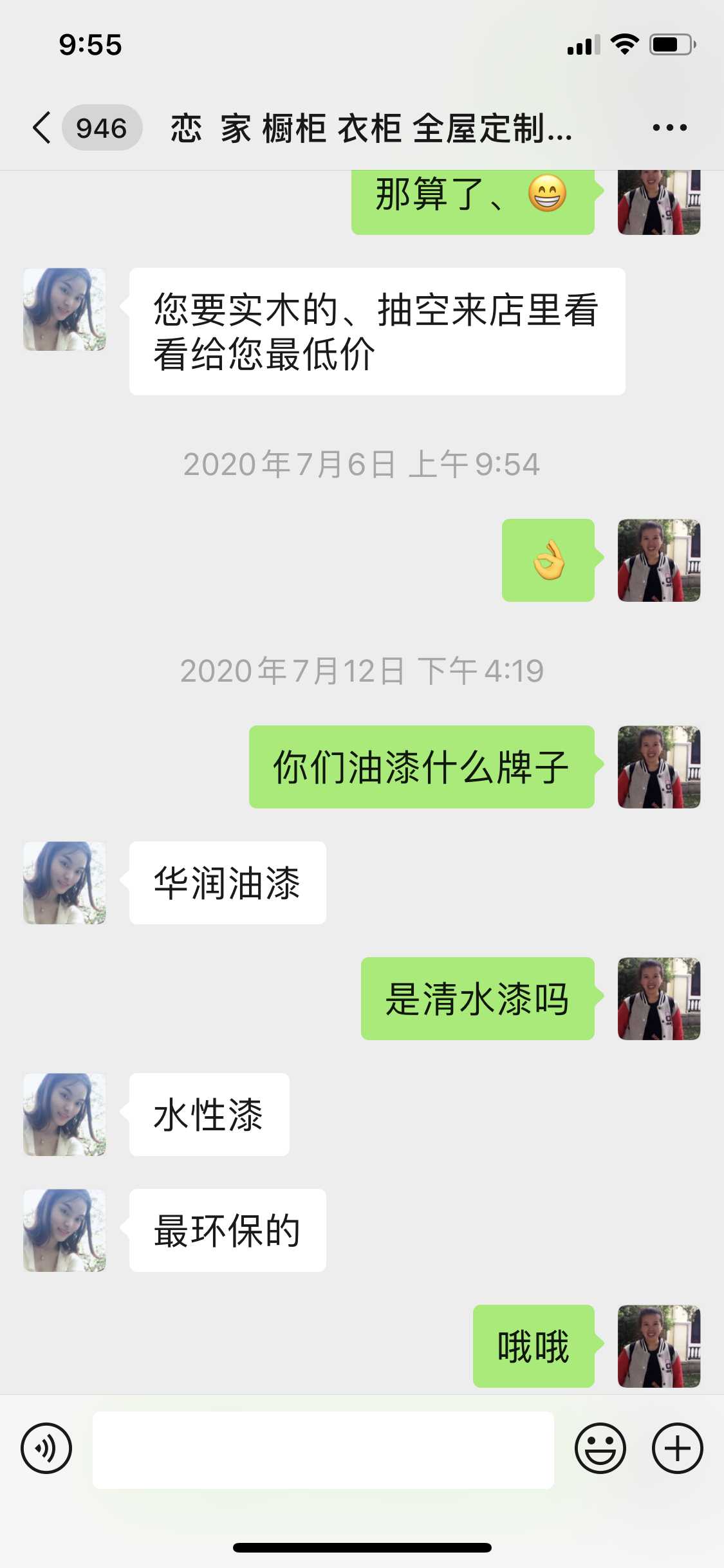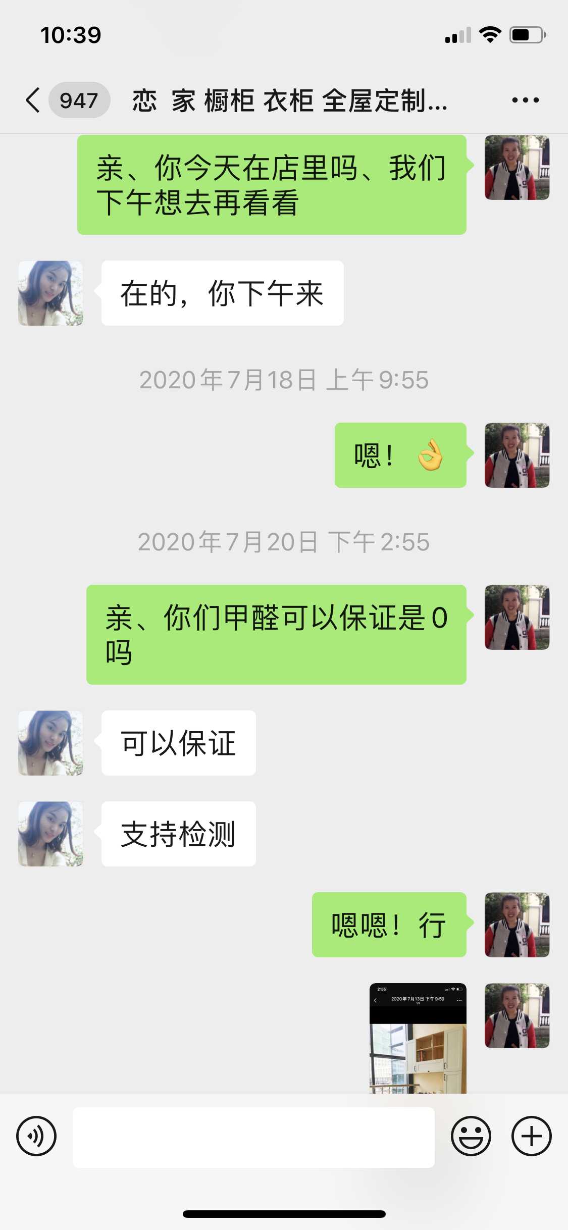 1、2020年7月20日、通过微信咨询南京市雨花台区恋家橱柜经营部负责人倪萍定制衣柜、说他们产品能保证0甲醛吗、她说可以保证?