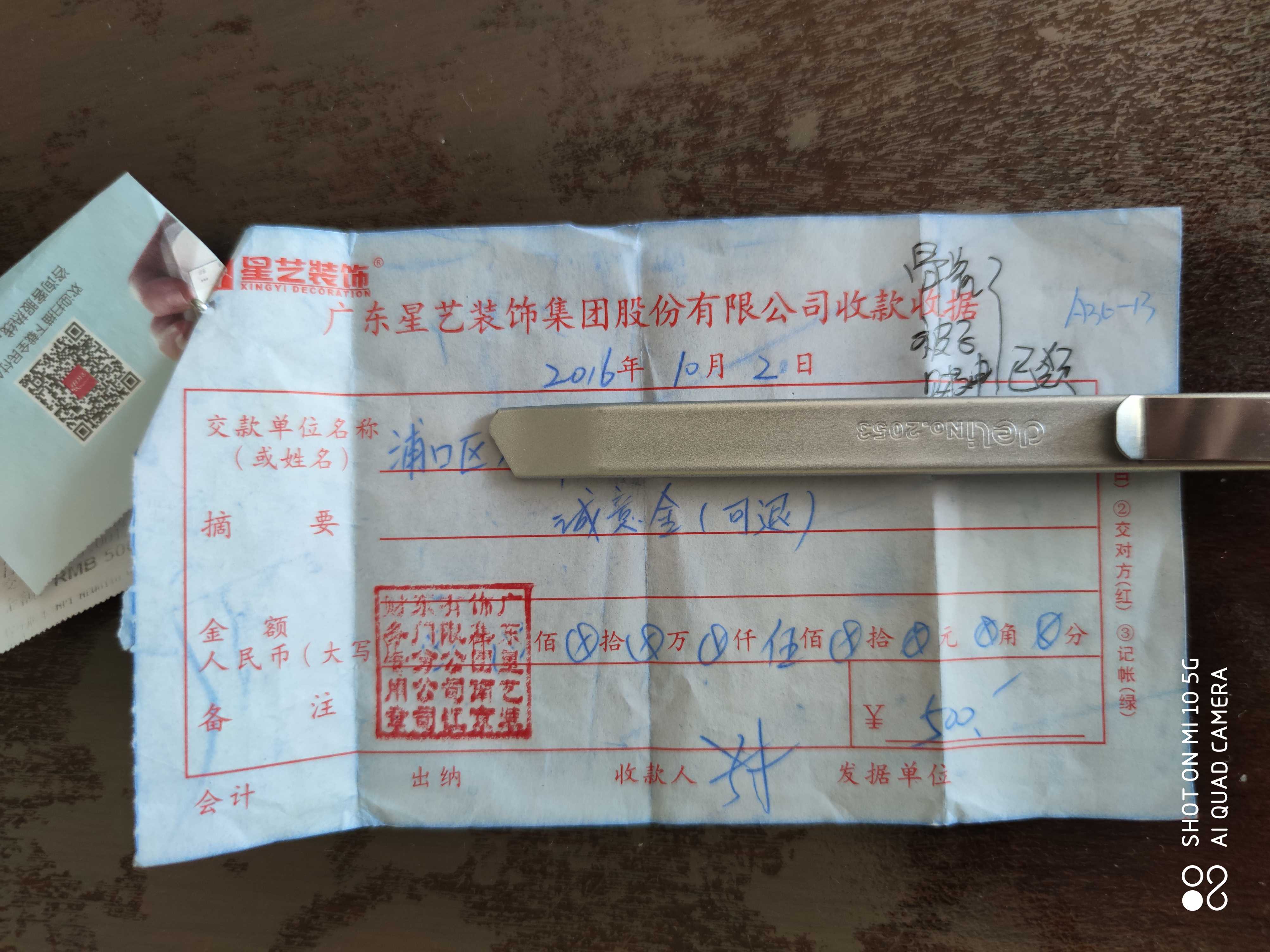 2016年10月,我应邀参加广东星艺装饰公司在长江路文化艺术中心的活动,期间交付500元诚意金参加砸金蛋中了一套碗。现在决定不装修房子了,想要回诚意金遭到该公司人员刁难,说要返还4年前所中奖品。