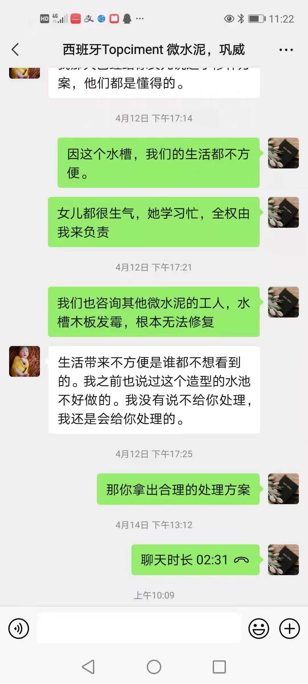 1、再次与微水泥负责人沟通:回复昨天和消费者已沟通好,消费者自己进行造型的改造,我们后续施工,常规造型没有过多的棱角,施工不会再出现问题。2、维权站沟通:为配合微水泥工艺的施工,对卫生间材质如果有要求,建议微水泥负责人和消费者沟通下。3、与消费者再次沟通:回复维权站没有沟通好,造型啥的应该微水泥负责承担,为什么是我们?维权站建议消费者,双方再沟通,沟通不了与维权站联系。 | 2021-04-27 |