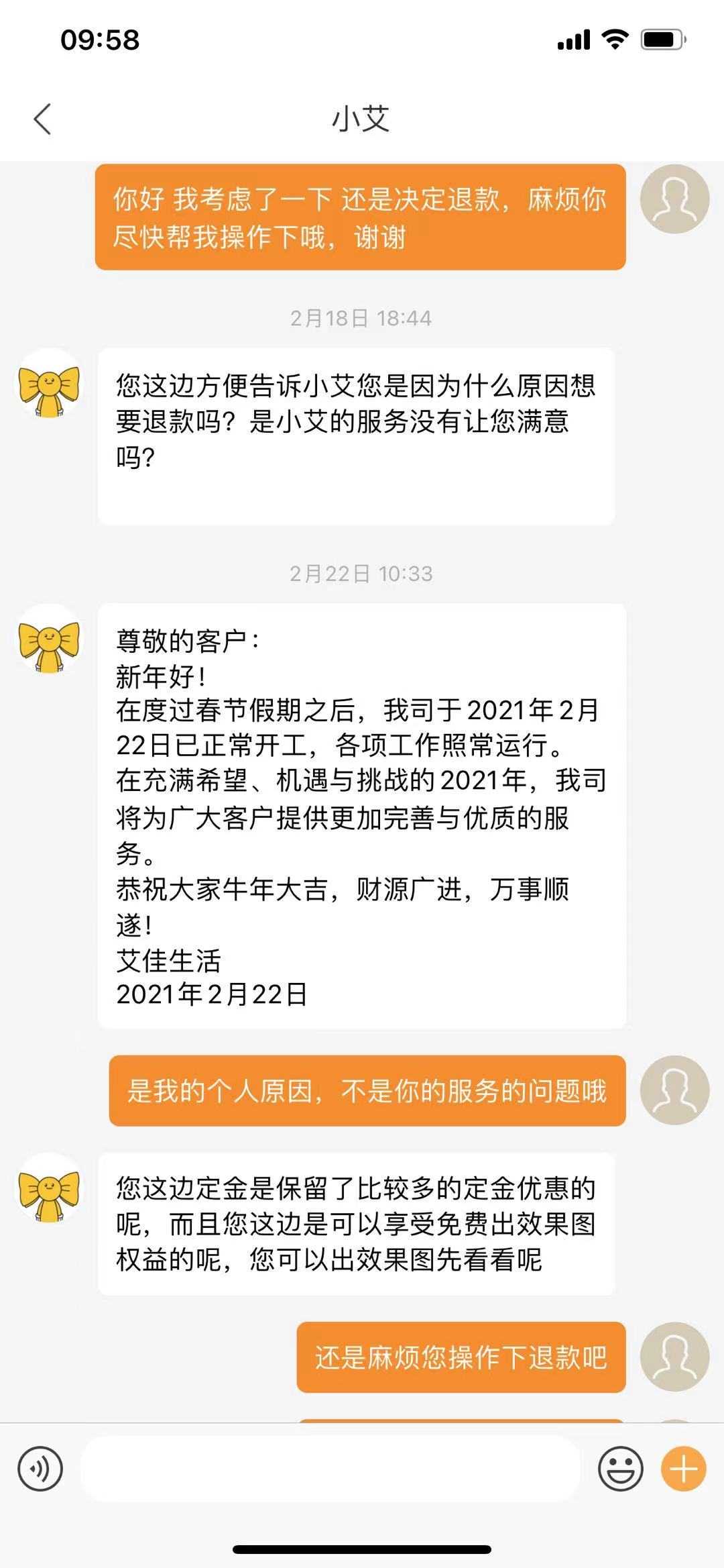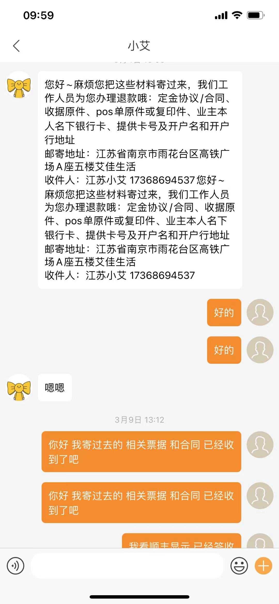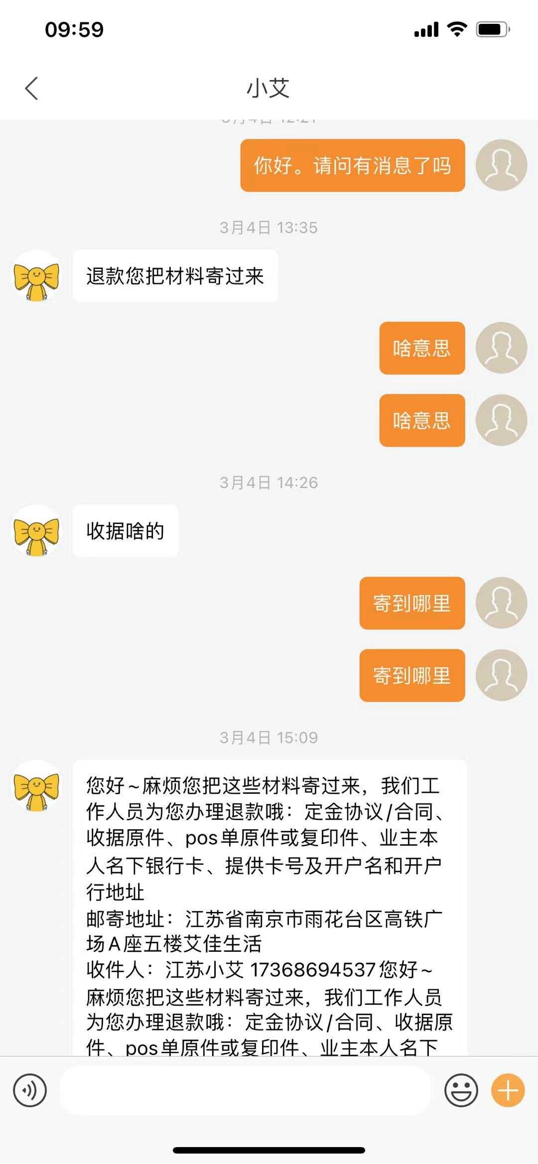 2.本人在2021年3月4日与艾佳客服人员通过app沟通协商退款。客服人员同意退款,我将相应材料(合同,收据等)按照对方要求寄还到客服指定的地址。客服反馈于3月9日收到了材料,并说明已经发起退款,退款期限在4个月左右。