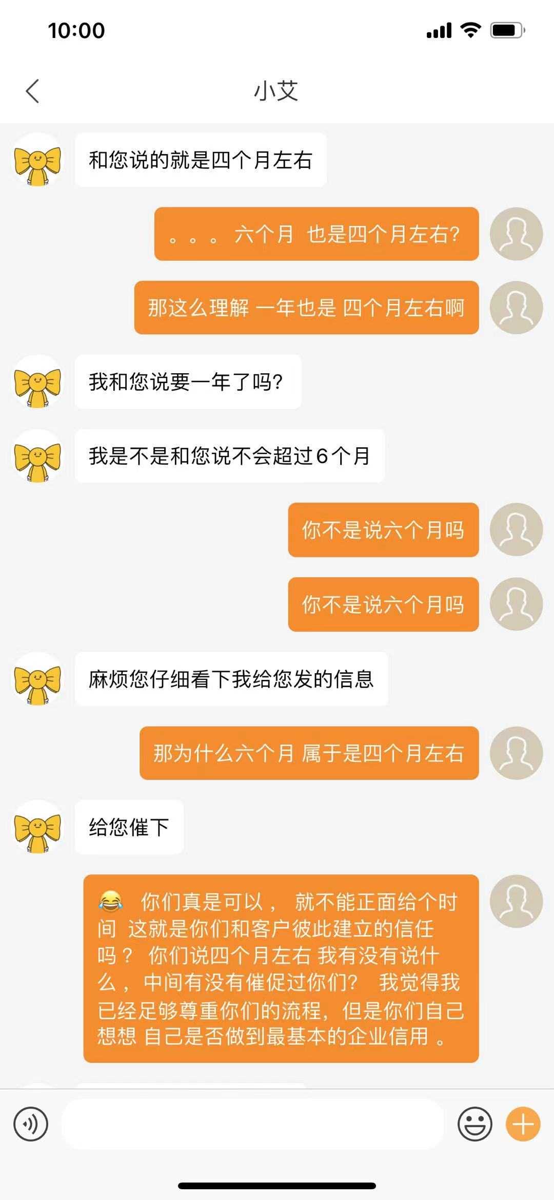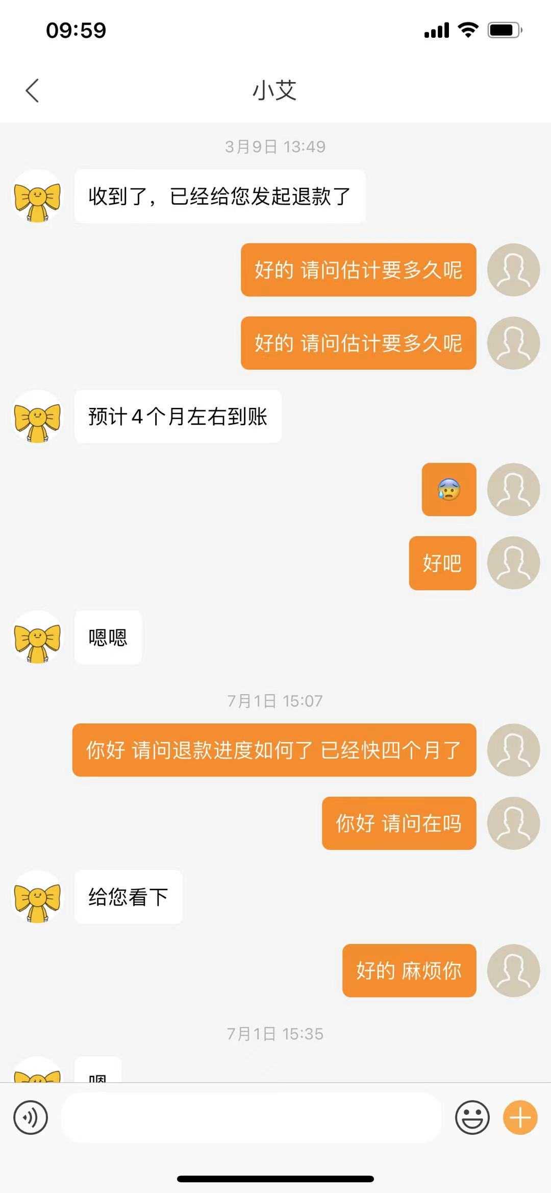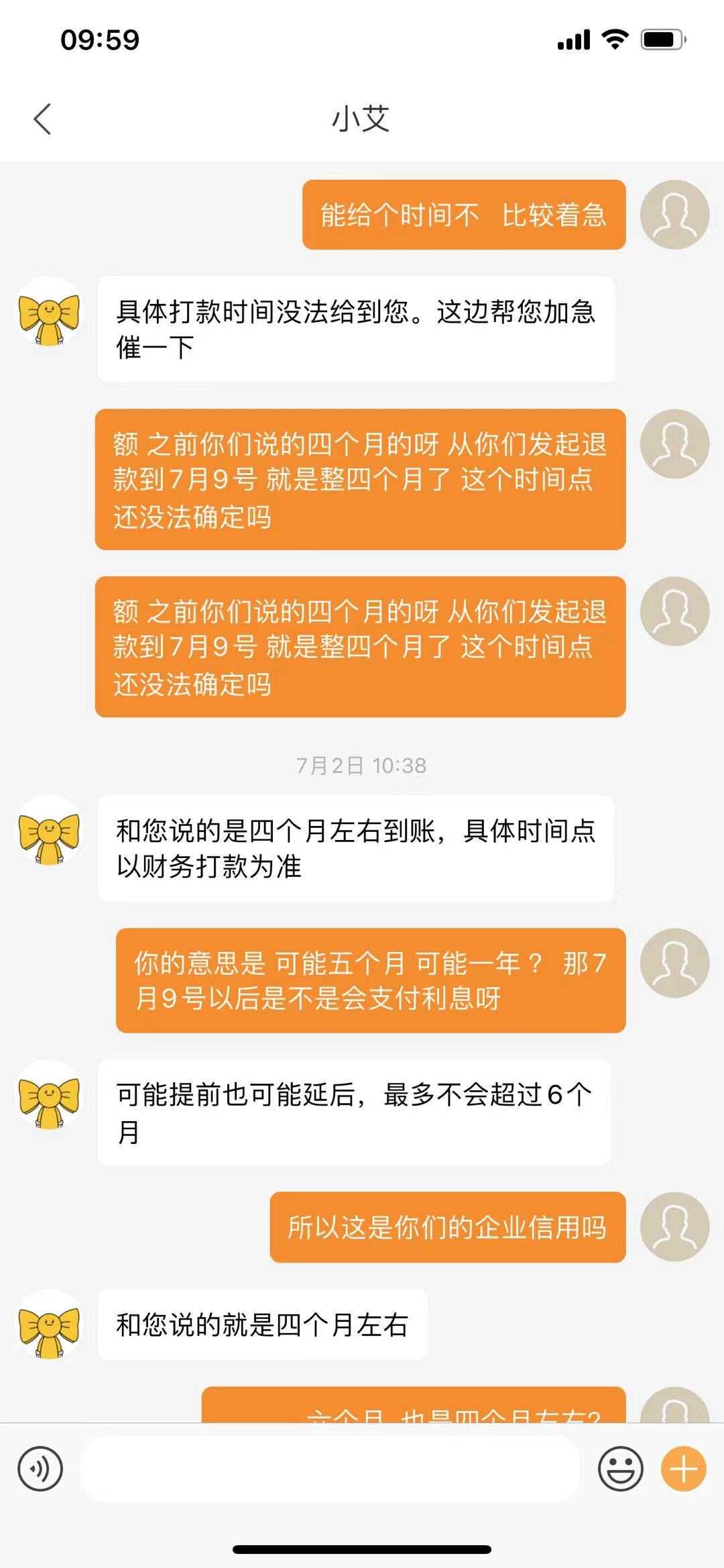 3.本人于2021年7月1日(约定的打款时间应在7月9日左右)向艾佳客服人员询问退款进度,要求他们给出大致的打款时间,对方客户整个过程答非所问,含糊其辞,逻辑矛盾,又说退款不会超过六个月。