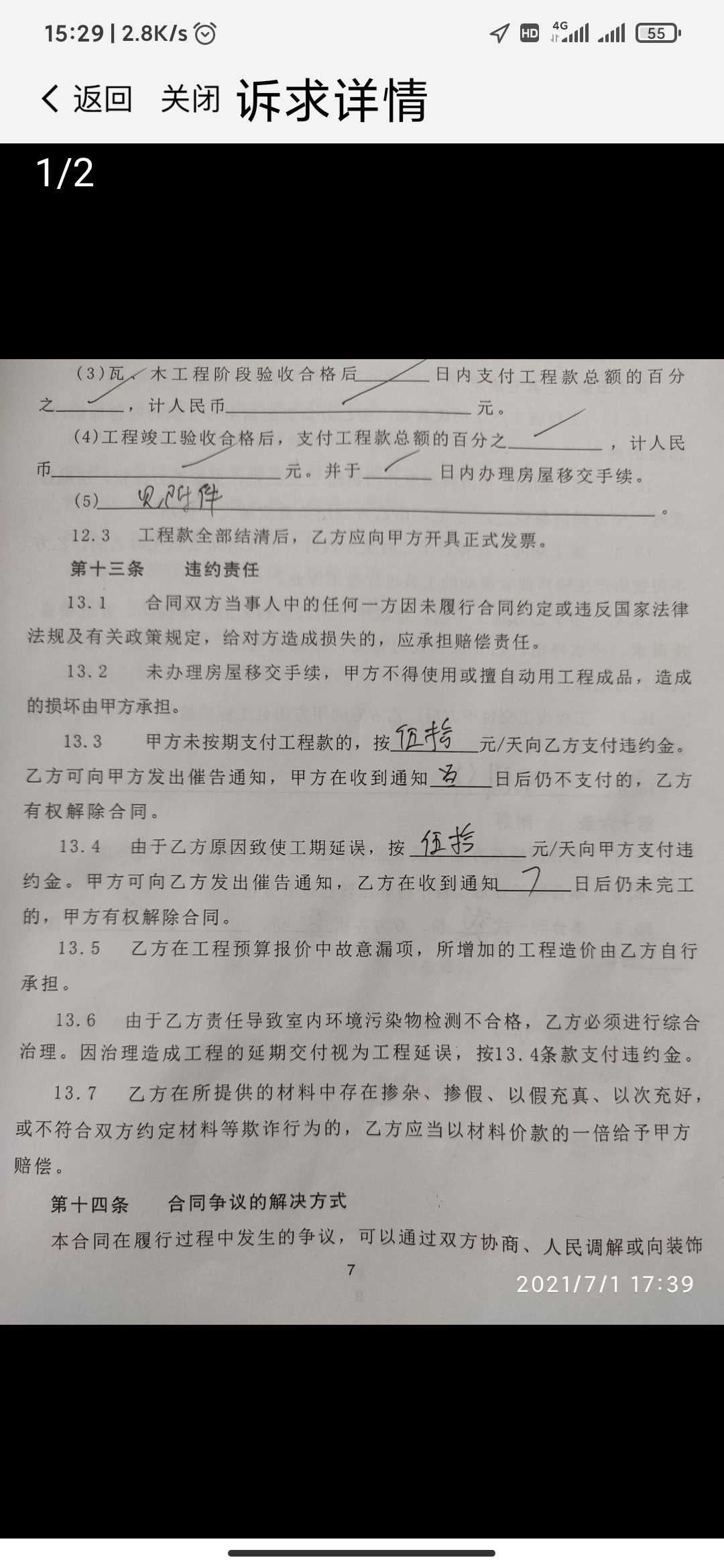 诉求:按合同条款进行延期赔偿,50元/天。