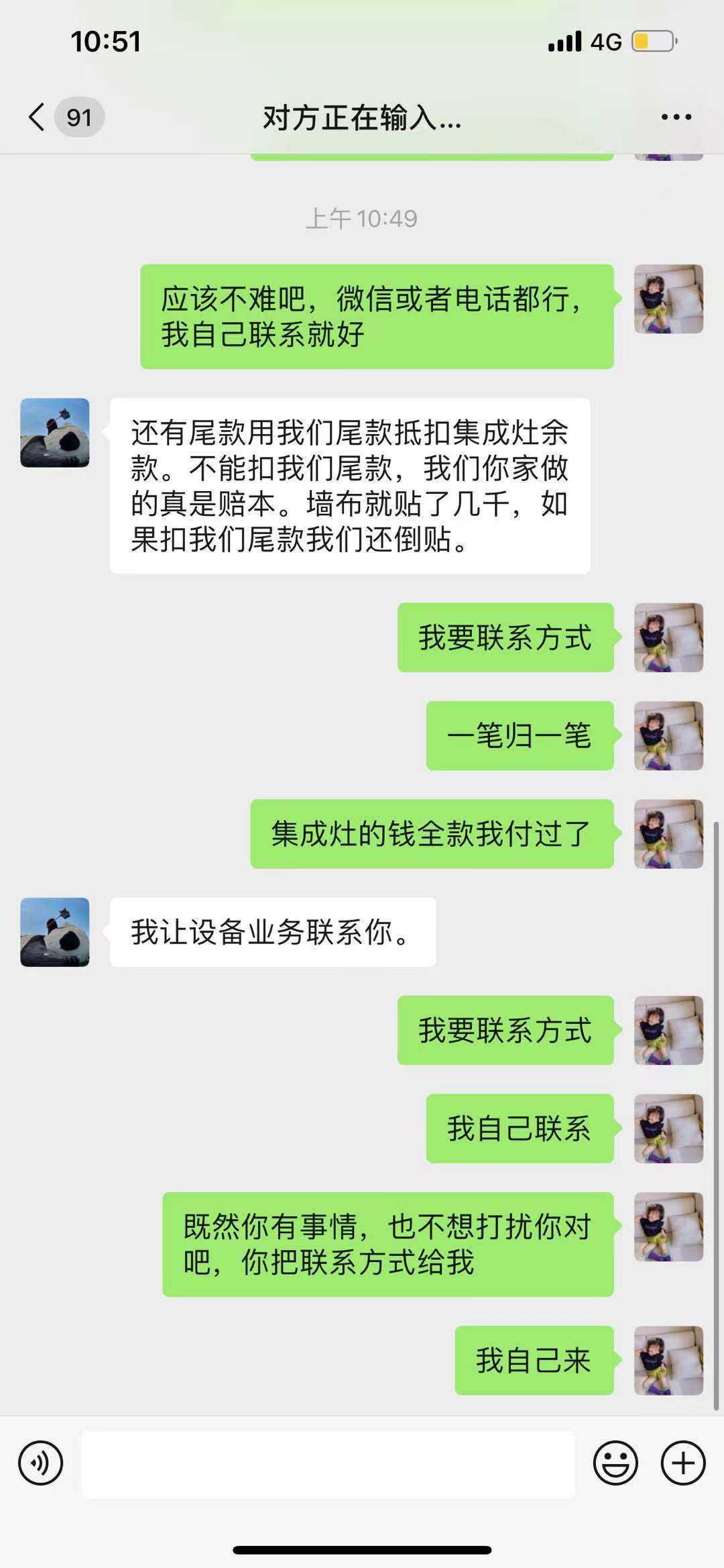 诉求:8月底前必须完工,需要调整的地方到位;按合同支付违约金;集成灶安装到位。