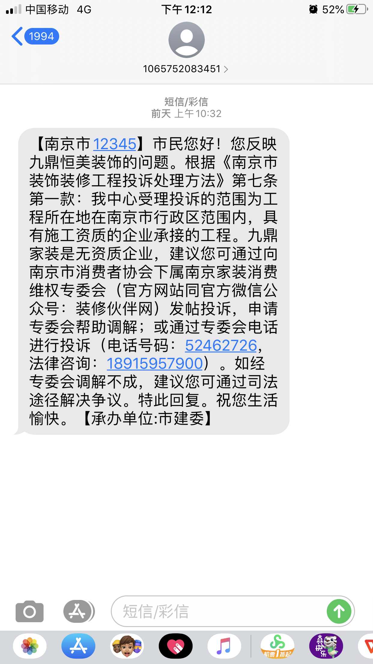 | 投诉类型 | 拖延工期 | 投诉人 | 张** | 被投诉单位 | 南京九鼎恒美装饰工程有限公司 |