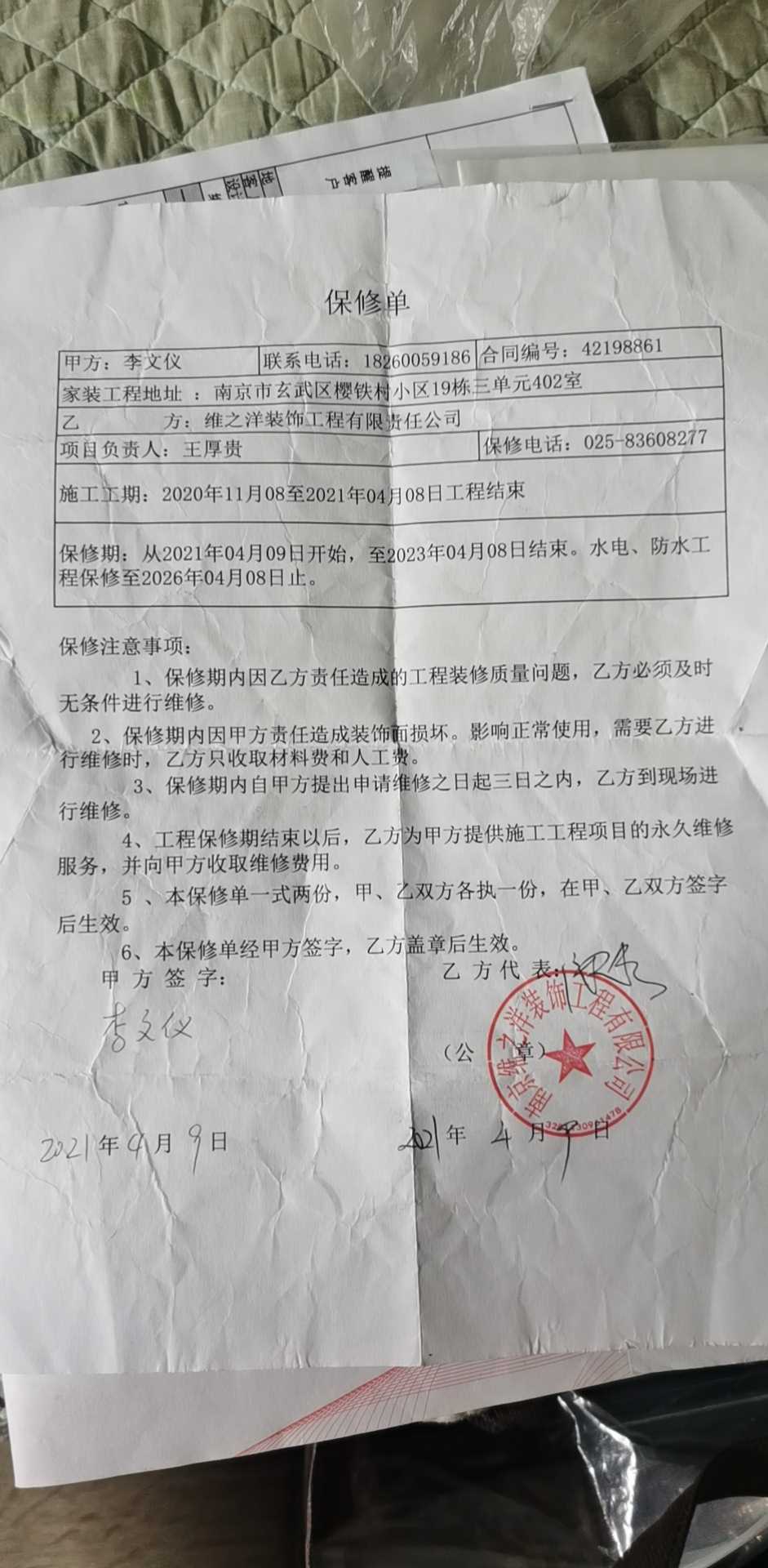 投诉类型 | 施工质量 | 投诉人 | 魏** | 被投诉单位 | 南京维之洋装饰工程有限公司 |