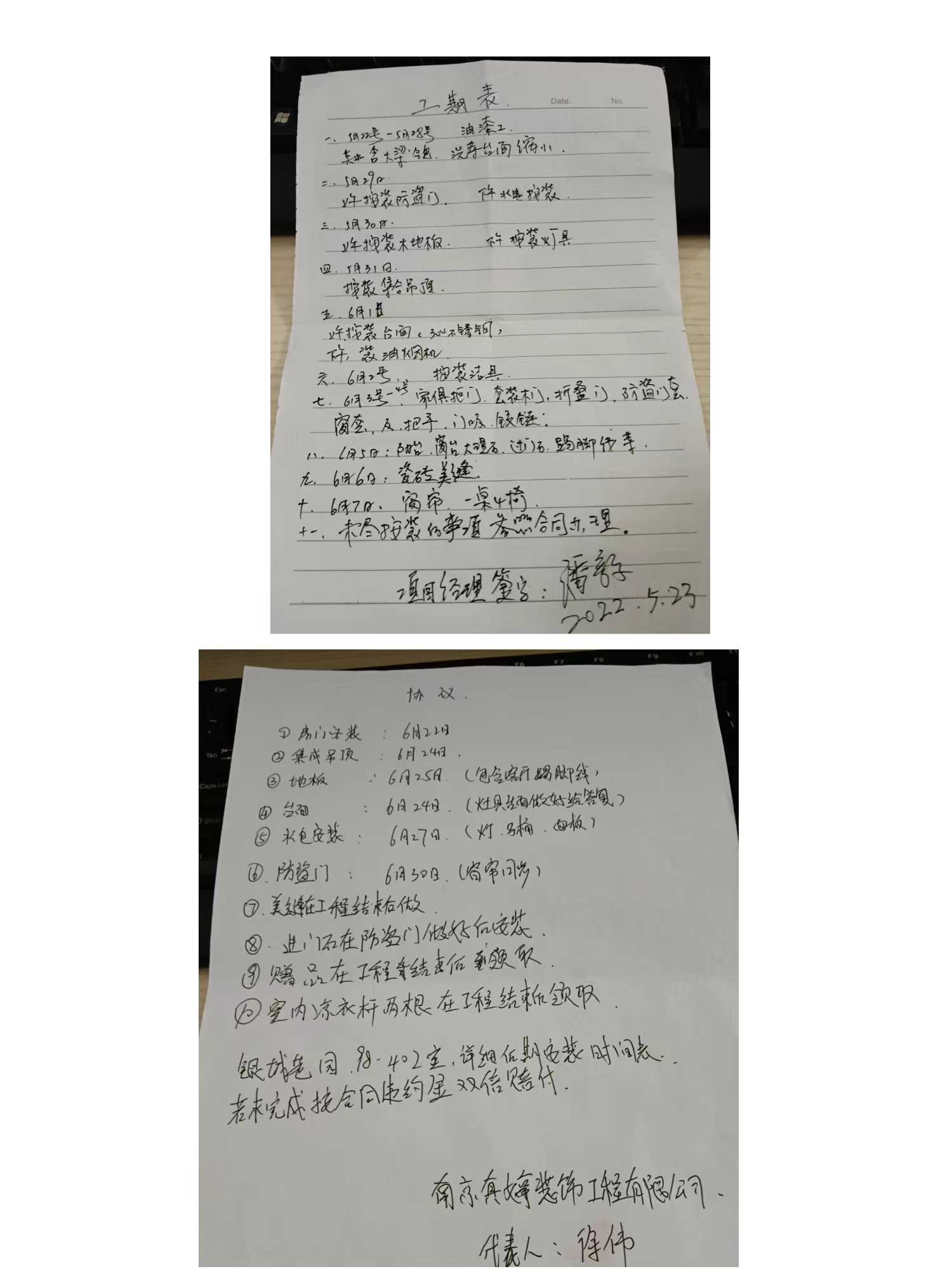 业主与南京真婷装饰工程有限公司于2022年2月28日签订装修装饰合同,定于2022年5月28日完工验收,工期90天。但是截止到2022年7月1日,南京真婷装饰工程有限公司未按照装修合同约定完成装修工程,目前房门、柜门、集成吊顶、地板、台面、卫浴、防盗门、美缝等主要装修工程都未完成,业主多催促该公司已各种理由拖延不予解决,后来在燕子矶派出所张警官的调解下,业主宽限到2022年6月30日让其完成施工,该公司签字按手印保证在宽限期内完成。截止到现在,施工方对上述项目一点未动,未履行调解协议。