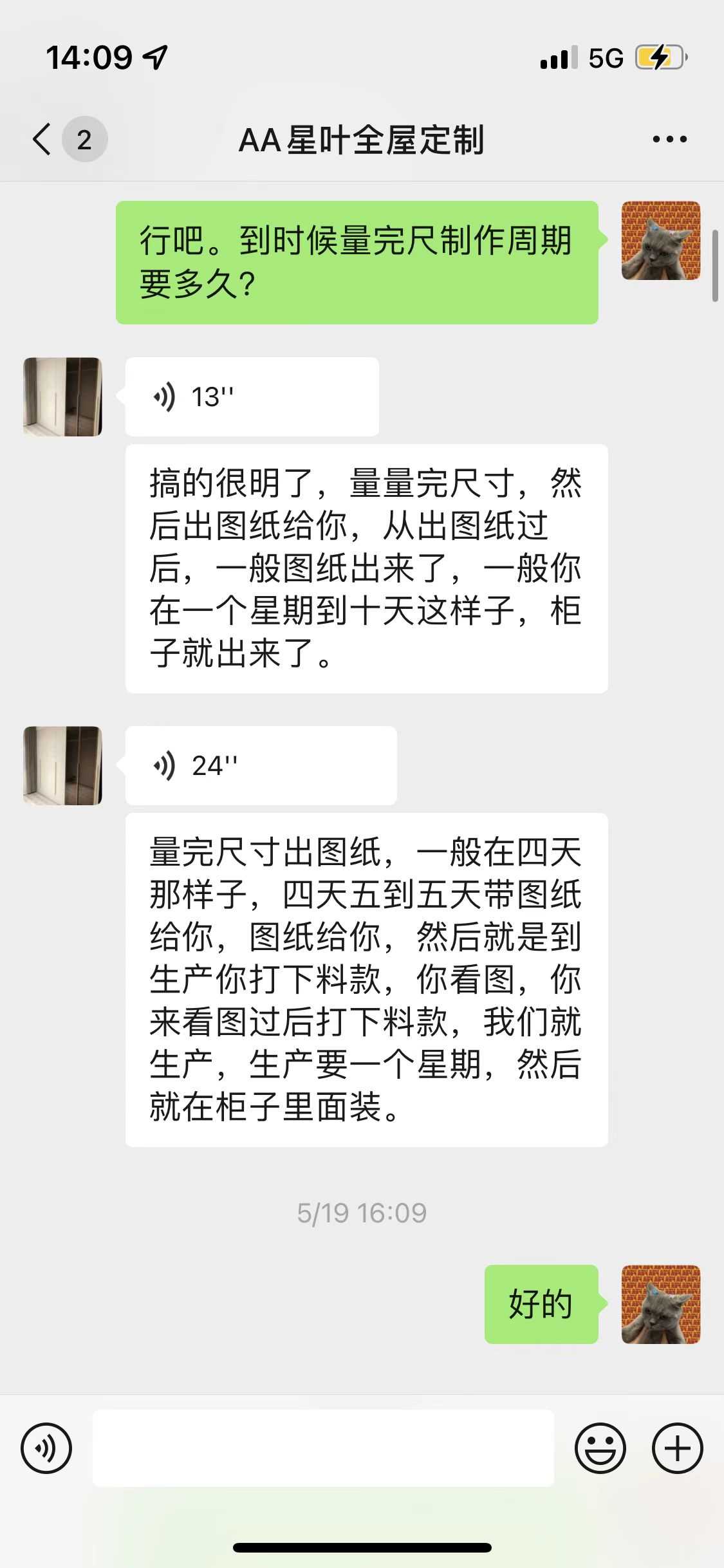 1、从支付定金到第一次付完下料款,店家告知的合作流程为:量尺-出图-确认后支付下料款-安装。10月28日柜体安装完成;29日石英石台面安装完成。29日当天联系商家,协商柜门量尺和安装时间,被告知柜门需要再付一笔下料款,开价2000元。同一笔订单要求支付两次下料款已经是闻所未闻,我勉强同意支付1000元,店家不同意,协商未果。