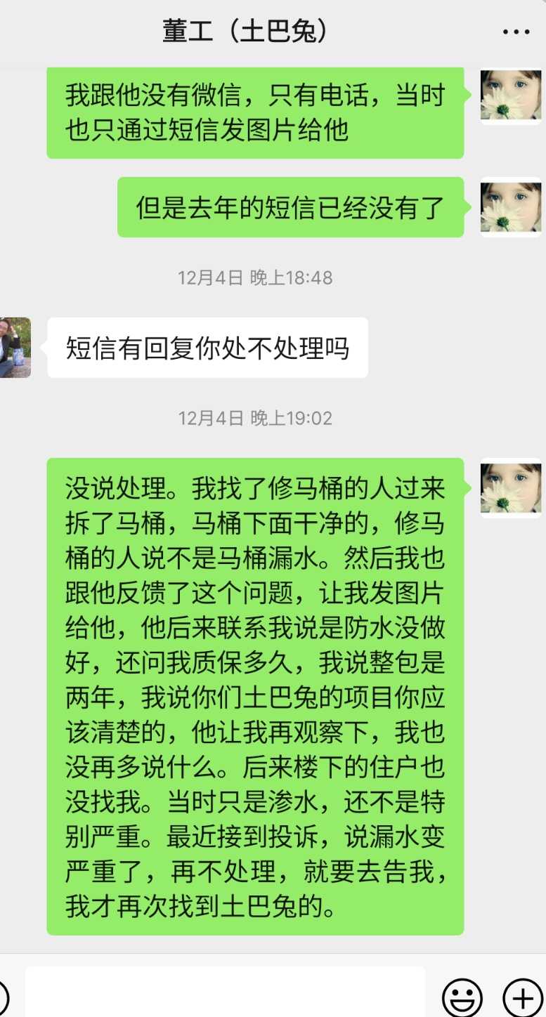 房屋2017.1.30日竣工,2021年10月联系客服卫生家防水问题,联系后发送相关图片给土巴兔,工程人员回复说是防水问题,没说怎么处理,只让观察。截止2021.10月,卫生间防水还在保修期。2022年年初,楼下业主又反馈还是漏水,又联系土巴兔,还是没人处理。2022.12月出,再次联系土巴兔,沟通后又没有下文。现已自己联系专业人员重新做了防水,花费了很多钱,这个费用应该由土巴兔承担。
