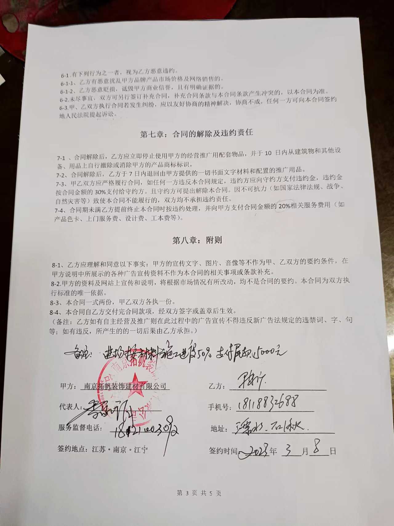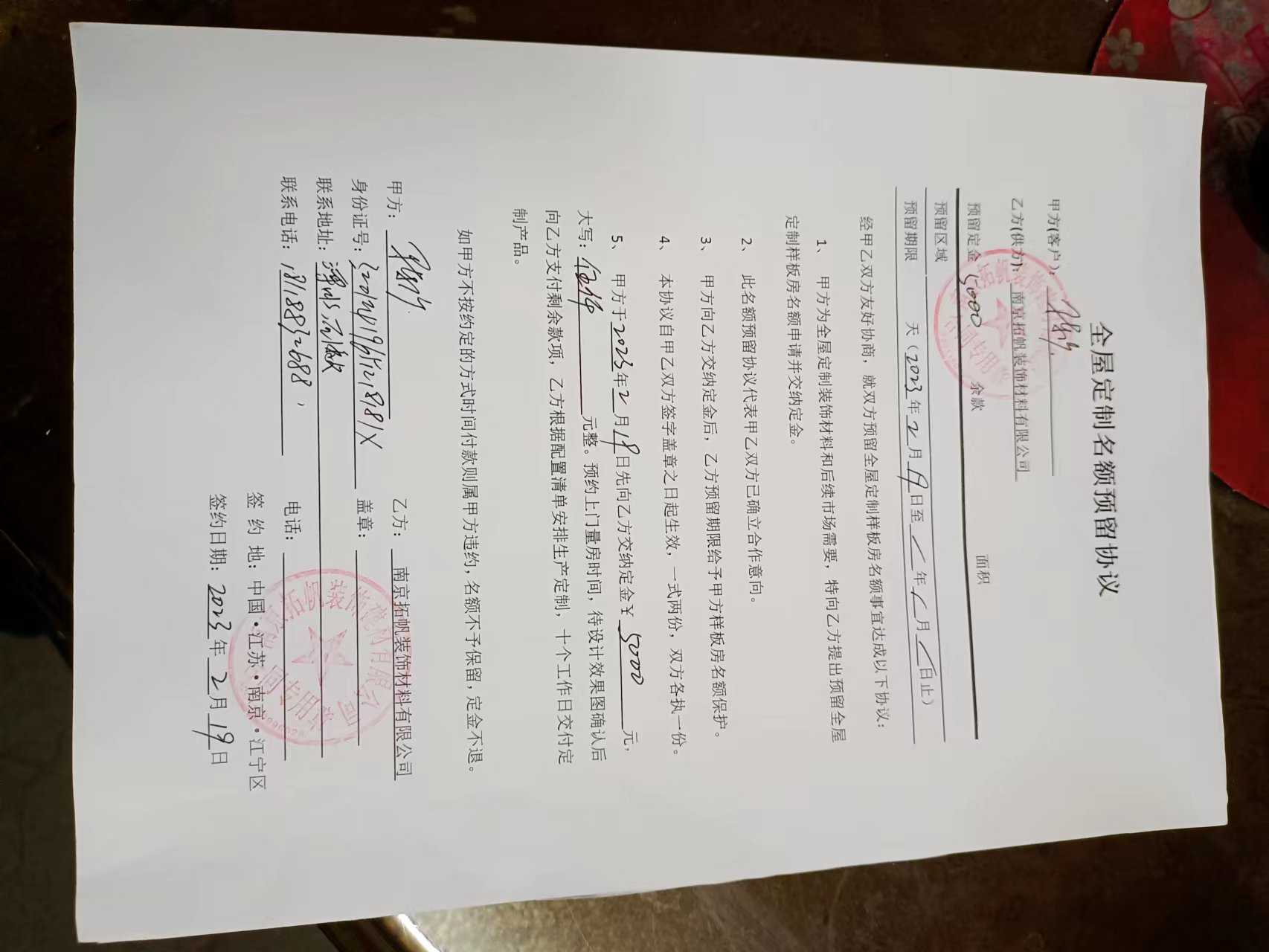 我是在抖音上发现南京拓帆装饰建材有限公司的广告的 他们的宣传的是120平方房子59800包整装 于是我去他们公司谈了 当时也看了他们的样板间 当天我就交了五千块钱签了给我做样板房预留协议 后来也谈了几次说好了我把水电做好交给他们 他们把房子整装好交给我 期间他们来过两个设计师量房和做效果图 最后我们谈好了90平方套内面积承包价是70000块钱 当天到快下班的时候匆忙中交了五万预付款 那个什么李总翻着协议在我没机会没时间看内容的情况下让我签了这份协议 当时那个李总的签名我到现在也看不清 还有他留的电话也明显不对(这是我当晚联系不上他直到第二天才发现的 而且他改了几次都不对) 可我万万想不到他们这么大实体公司做生意是这种套路 晚上回到家我忙完后仔细看了下协议内容 可里面完全不是我们讲的那样 协议里我成了他们的经销商了 我当即跟那个黄龙总监联系 可他到第二天中午没有回复于是我又去了他们公司 我本以为是友好协商 补充一下就可以了 可他们公司接连来了几个人 改口说不是全包 说还需要我来出工人 出材料这些之前到协议从没有提到过的要求 我说他们说话不算话要求解除协议 可他们要求我要么加36000继续做 要么付违约金15000 我报警 警察喊他协调他不愿 我至今十多天已经经过几番周折才到了这里投诉 他们拿了我五万五千块十几天了到现在没人理会 今天下午倒是有个什么徐经理联系我了 可还是坚持要我付违约金什么的一万多 可我认为这不是我违约 是你们不诚信才导致我不敢跟你们合作 我也愿意承担两千块算他们工程师的工资 其余五万三全额退款 可他们坚持要求按协议办 故我请求相关部门给我解决 谢谢!