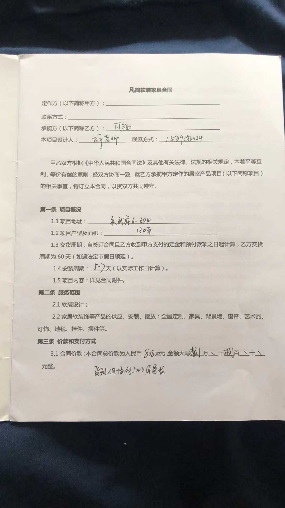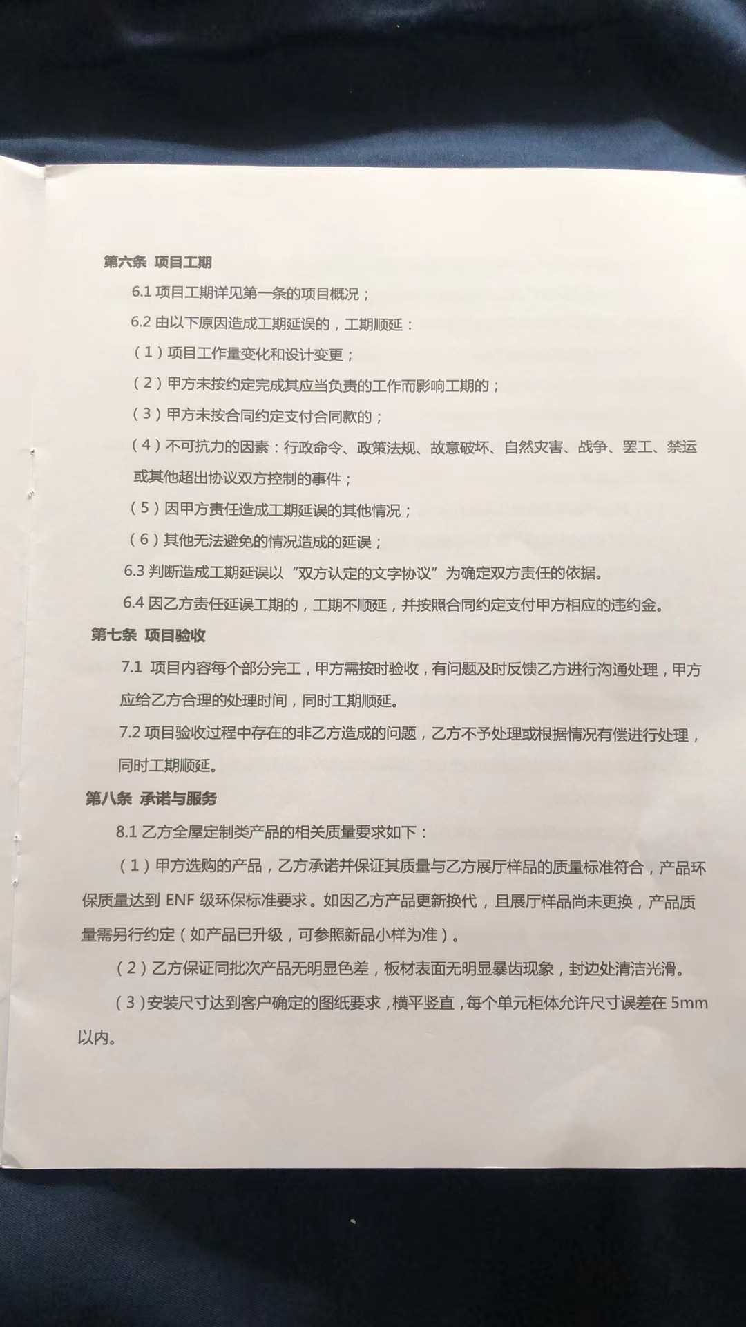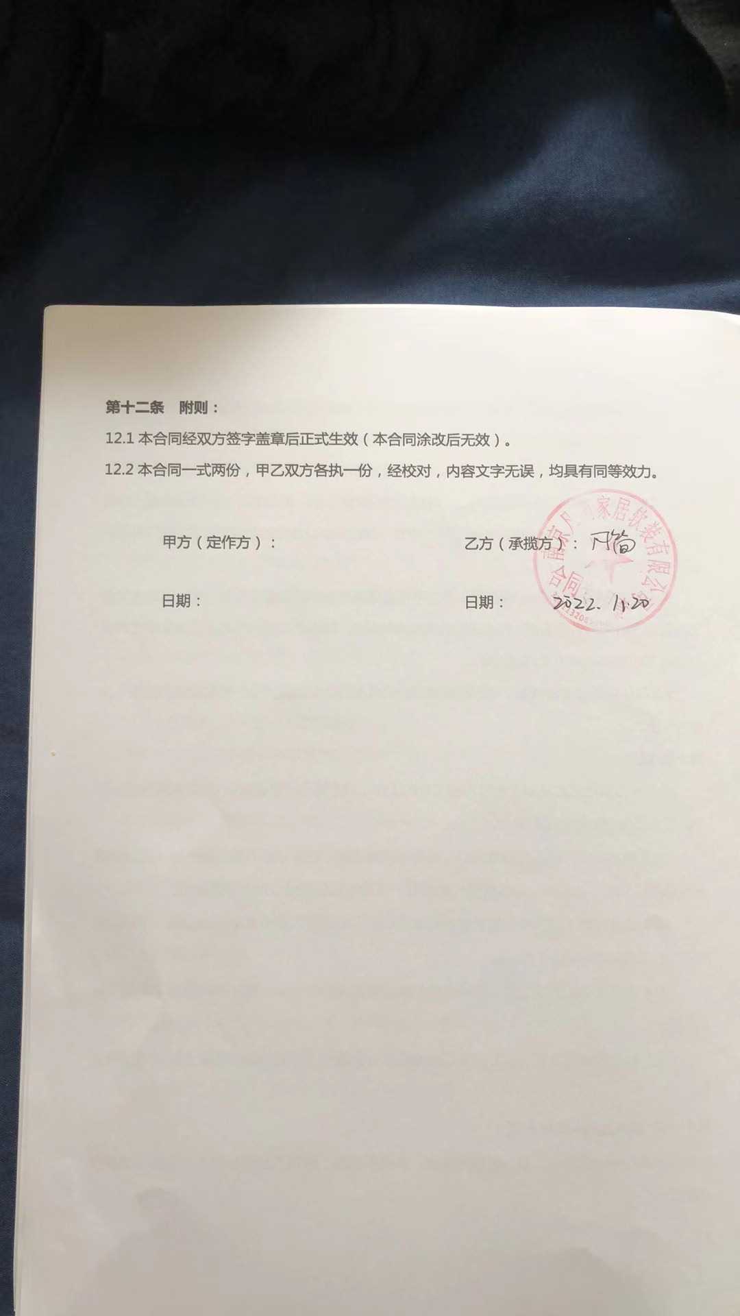 我这里是2022年11月20日付完约定款项,我们双方约定尾款留5000元。按合同上规定的定制时间60天,遇法定节假日顺延,应该是2023年2月15日交付家居板材进行安装。我在1月份问他们板材什么时候能交付安装时,设计师回复我说还未复尺,我家客厅改瓷砖了,他们需要去复尺。我家瓷砖改造春节前就已完成,他们并未去复尺。交付时客厅电视柜安装时高度镶嵌不进去也是安装师傅现场切割的,可见这就是他们拖延的说辞。