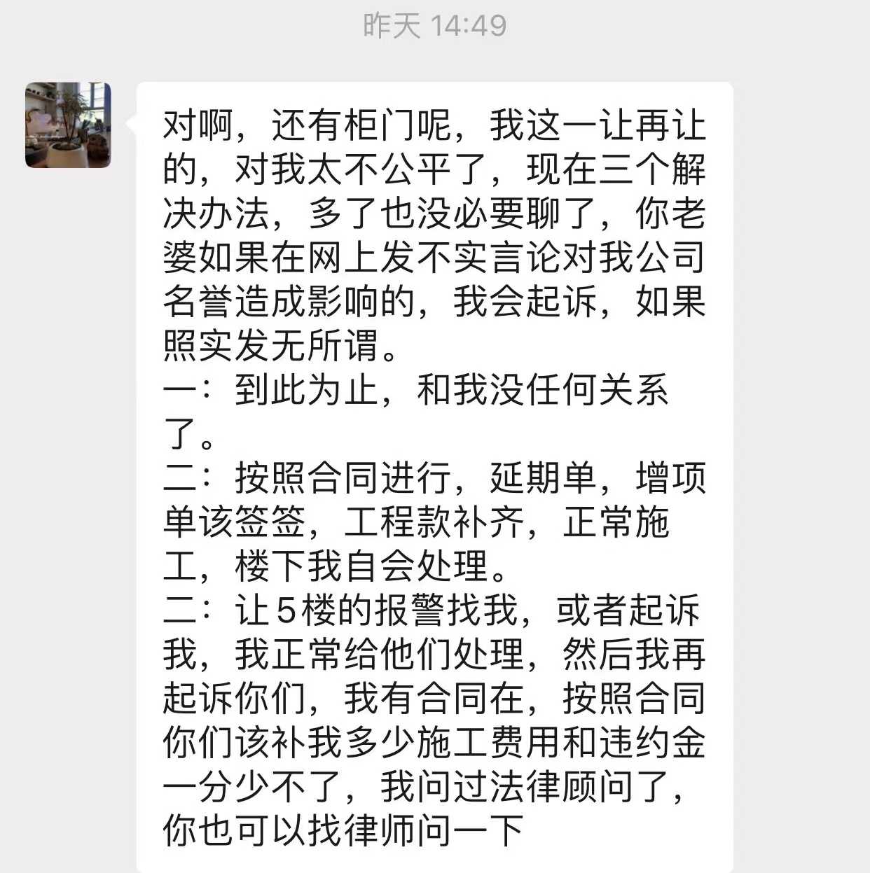 诉求: 协商解除合同,剩余款退回。同时漏水楼下问题需要解决,所有目前的工程需要质保。