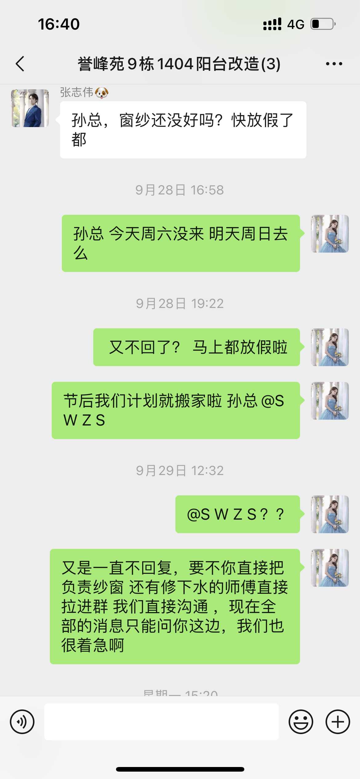 7月14日签约后,约定7.19日进场施工,实际过程中拖至7.18日,又拖至7.19日,过程中一直拖延施工进度,到8.17日进度始终缓慢:按周度进度看,第一周砸墙施工1天,第二周基本没干什么,第三周水电施工1天,第四周防水2天,第五周没有工人进场施工;33天工期过去仅完成阳台 厨房门的拆除,过程中一直督促,8月18日严肃沟通定于8月22日能完成贴瓷砖等瓦工的全部工作,实际8月20都尚未完成且工人没有提前通知情况下提前离开,对方都没有合理的解释,因据理力争,对方同意尾款2000元不收及做完后再退款2000元的方案,同时需另外找工人,8月24才安排新的工人完成瓷砖张贴,8.26日完成基本瓦工的活,8月27日发现部分贴的瓷砖掉落,及拆除部分修复不合理,水电未改等,一直督促进度,对方一直都是在安排在安排,直至9.3才完成阳台的瓷砖、吊顶、美缝;9.6查看地漏堵住、门缝未修复、部分插座未装,9.12日完成部分修复,直至9.17日地漏始终拥堵、纱窗一直未安装,9.25日沟通9.30前可以完成安装,实际截至10.6都尚未安装,并且从9.28日起对方微信不回复、电话不接,态度极其恶劣;