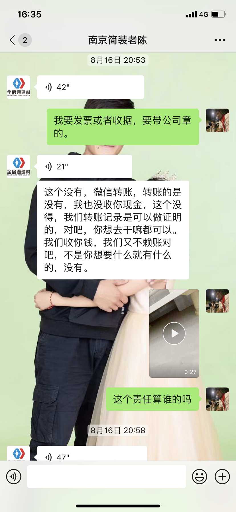 南京全房通大宅装饰设计工作室,老板陈中华,电话189****866,仓库在南京市浦口区花旗心聚缘装饰城 B4栋,1拖延工期,2施工人员素质差(不是所有人)3装修公司说一套做一套,4瓷砖质量差,前后开裂多块,5不按照合同施工,6除了加钱还是加钱,7没有发票收据,不写合同里,也不口头说清楚,消费者问要发票或者收据,才说没有发票或者收据。本消费者所陈诉事实愿意承担一切后果。