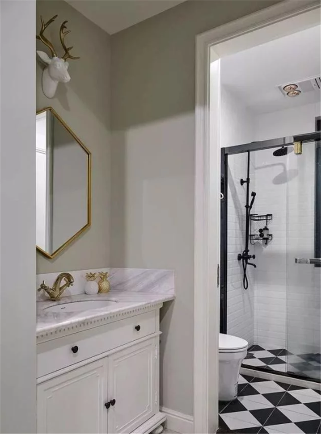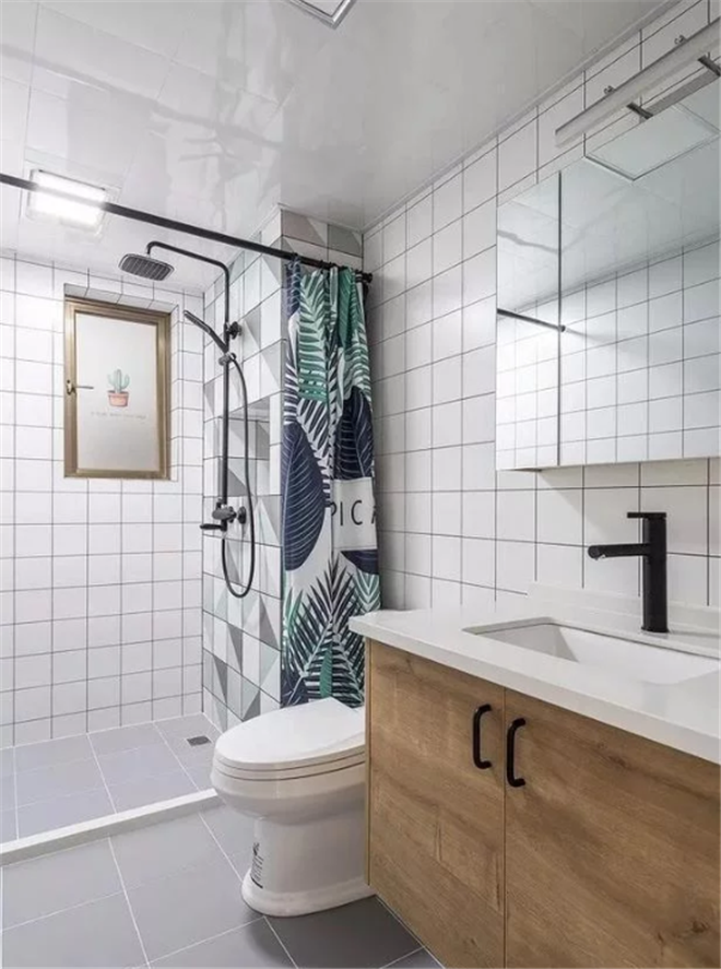 如果你家卫生间不是特别大,就不要想着把什么都塞进去了,浴缸拿掉,洗衣机拎出来,台盆独立出卫生间之外,你会发现小小的卫生间用起来还挺宽敞。