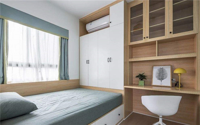 11、小房间采用集成家具,对于小面积的房间家具摆放讲究技巧,集成家具可以将衣柜、书桌、收纳规整定制,更加贴合空间。