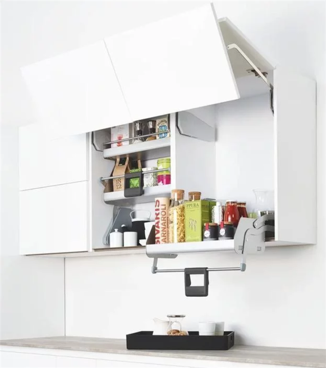 这时候就需要对吊柜进行特别设计,用拉篮替代层板,上翻门替代平开门,可以大大提升吊柜的空间利用率,同时也能有效避免碰头。