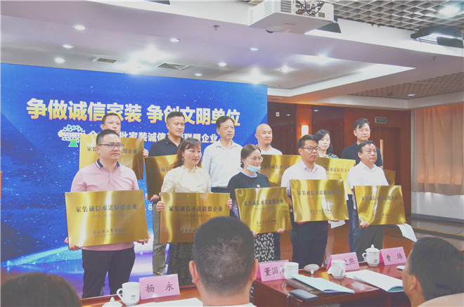 南京市消费者协会会长王之熙向首批加入家装诚信承诺联盟企业授牌。