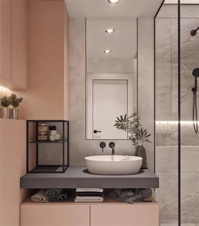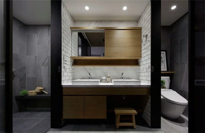 条形卫生间做干湿分离具有先天优势,但是这样整个动线会被拉长,所以可以将洗漱区独立在外面形成一个半开放区域,实现三分离。