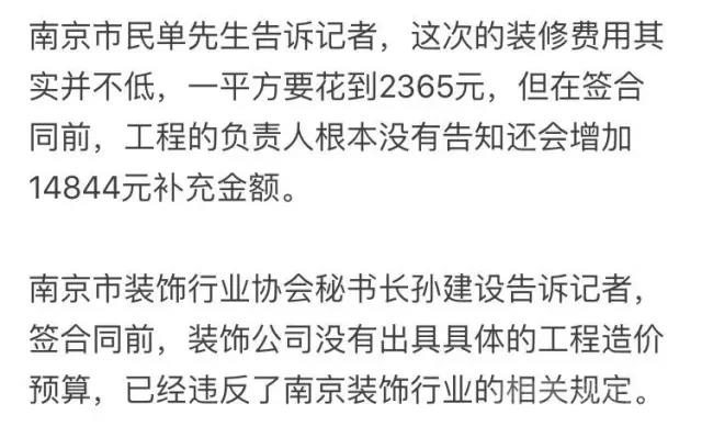 单先生:一张让人愤怒的“补充合同” 今年10月15日,单先生和妻子来到位于奥体大街环宇融侨广场的四楼的生活家装饰,准备把自己63平方房子重新装修一下。单先生说,因为平时工作比较忙,所以他想选一个全包。当时接待他们是一位姓张的设计师。在之后商讨中,单先生被告知可以选择一个叫“拎包装”,具体的意思就是装修全包、无增项。在单先生提供的一份宣传单上,记者看到,这个所谓“拎包装”包括人工、全屋主材、水电改造、灯饰、家具和厨电。10月23日,在没有看到工程造价表的情况下,单先生跟生活家签订了一份装修合同,计算的装修价格为63平方米,总价为149005元,每平方米造价为2365元。单先生告诉记者,据他所知,这个装修报价应该比其他装修公司要高,但是这位姓张设计师一直强调他们公司服务好,预算等于决算,拎包就能入住。签完合同后,单先生支付了合同款的20%,29801元预付款,并且还支付了6000元设计费和2500元拆除费。11月8日,也就是快到开工前一个星期,这位姓张的设计师突然给单先生的爱人发了一份《补充协议》,补充金额为14844元,包含了水电改造、背景墙、吊顶拆砌墙、抹灰等17类增项。单先生说,这个《补充协议》他们不能接受,非常愤怒,感觉自己被圈了进去,商议三次,最后生活家一直没给出的一个满意的说法。 生活家:签合同前我们都是明确告知的 12月7日,记者联系了上生活家这位张设计师。他告诉记者,这个事情公司上下都知道,老总也知道,并且交给他在处理。张对记者说,这个单子很简单,就是增加了1万多元,但是单先生就是不愿意接受。对此单先生表示,出了纠纷后,张找的下属来处理此事,可是下属又不了解情况,他们去了门店,每次都要重头再解释一遍,结果接待处理的人又不能拍板, 这不是在拖我们吗?此外,在处理过程中,张设计师发微信说:国有国法,合同受法律保护不是你们想怎样就怎样的?单先生告诉记者,生活家这种处理态度,让他无法接受。装饰协会:签合同前必须提供具体造价表南京装饰行业协会孙建设秘书长认为,按照相关规定,在没有出具具体工程报价表时,装饰公司是不能让消费者签订合同的,更不能收取任何费用。生活家装饰公司这种做法本身就是违规。记者在2008年1月1日开始实施的《南京装饰装修管理条例》上看到,第十条上规定合同内容必须包括一项:价格、计价标准和支付方式、时间。记者昨天再次联系单先生,他告诉记者,他又和张设计师联系了,但张告诉他公司的报价是一口价,就是按照面积报价,没有明细。孙秘书长表示,既然是一口价,为何还要另外再收钱?没有明细,这种说法更站不住脚。此外,孙秘书长认为,设计费不开发票,只有收据,也是违规操作。