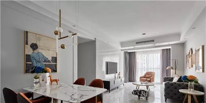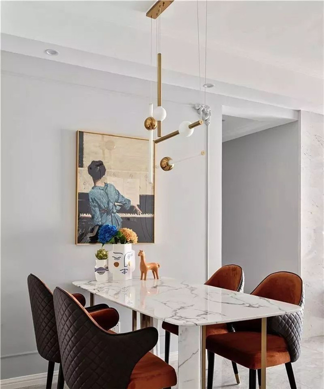 餐厅与客厅并没有明显的区域划分,开放式的布局让空间更为宽敞。大理石材质的餐桌主体、金属质感的桌腿,轻奢又大气。业主精心挑选的软装挂画及金属吊灯、简约舒适也上档次。