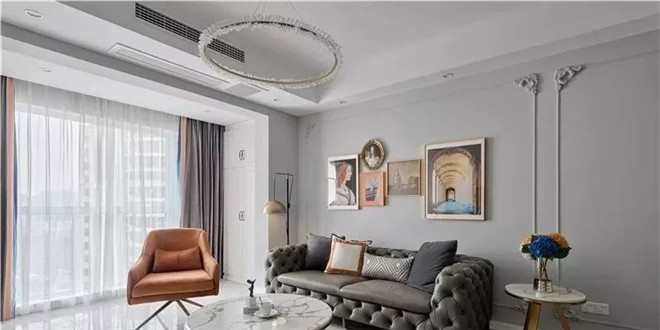 沙发背景墙不仅做了石膏线,还挂上了一些挂画装饰,看起来浪漫又气质,灰色的沙发、大理石材质的茶几,拥有整体感的同时也有满满的高级感。