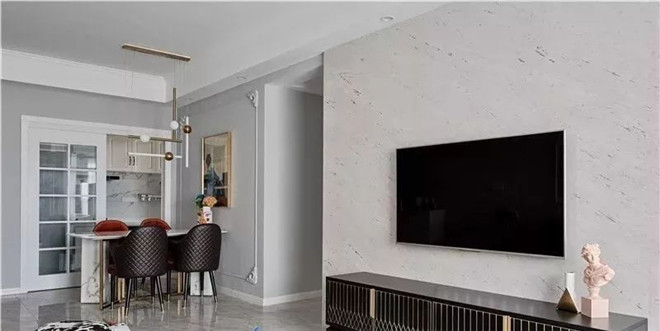 客厅里打通阳台并把阳台纳入客厅,显得客厅的空间更明亮宽敞,还在阳台的墙面上做了到顶的柜子,增加收纳。视背景墙选择了浅色系的大理石,浅色系的背景墙在视觉上更显空间宽敞明亮,搭配黑色电视柜赋予了更多的层次与质感。