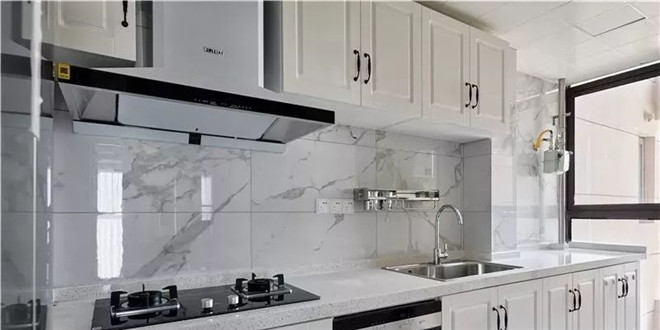厨房就在餐厅的对面,因为空间问题,所以设计了一字型布局方便操作使用。白色的橱柜,带有大理石纹理的瓷砖,还安装了吊柜,兼顾了实用与颜值。