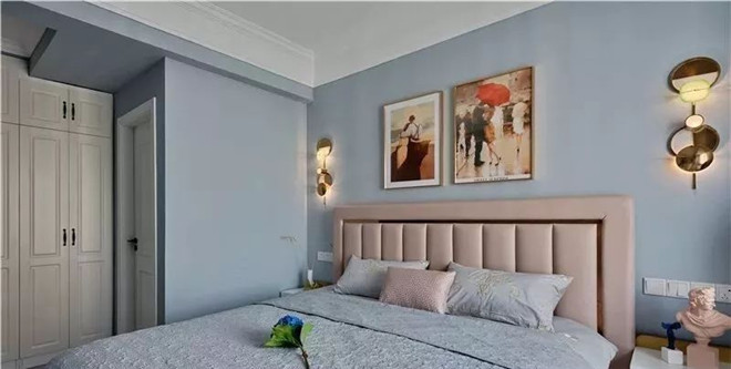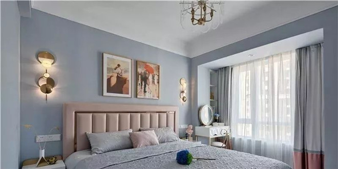 主卧清新温柔,淡淡的蓝色搭配浅浅的裸粉色,柔和的壁灯照明,加上挂画装饰,优雅大方使人不由自主的放松下来。打通卧室的阳台,摆放上小巧精致的梳妆台,墙面上做了壁龛,不仅可以收纳化妆品,还可以摆放书籍等。