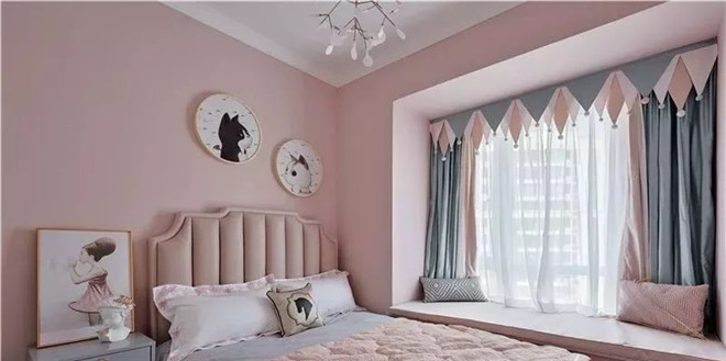 粉嫩嫩的儿童房,简直就是小公主的城堡,就连飘窗上也装饰的很浪漫温暖,小编认为实在是太适合当做小女孩的卧室了!床头背景墙上还有可爱的猫咪挂画,床上有可爱的抱枕,还有白色的大衣柜,有颜值的同时也兼顾了实用性。