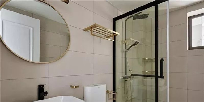 卫生间设计很简单,推拉门的玻璃隔断,墙面上还有毛巾架,黑白色加上金属点缀,增添一丝时尚感。