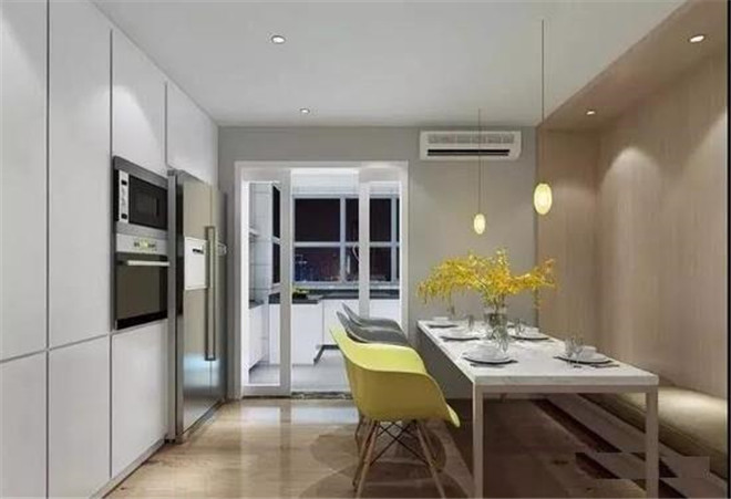 一字卡座其实就是用卡座代替一排餐椅,减少了移动需要的空间,下部又增加了收纳空间,对于餐厅空间紧凑的户型来说,这种设计是比较宽敞的摆放方案。