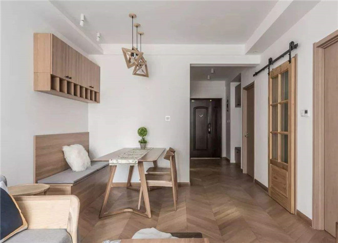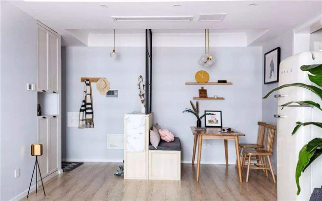 这种一体式设计给人简洁大方的视觉,既保持玄关空间的通透,还可以避免客餐厅一览无余。