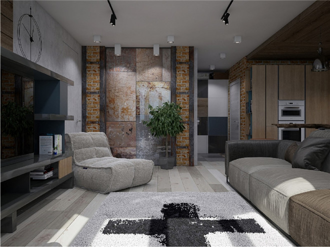 本案偏向于现代工业风,整屋充斥着工业风发元素,又隐隐约约揣着一丝文艺范儿。