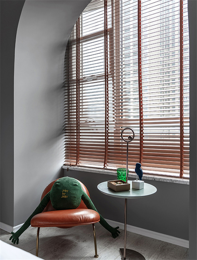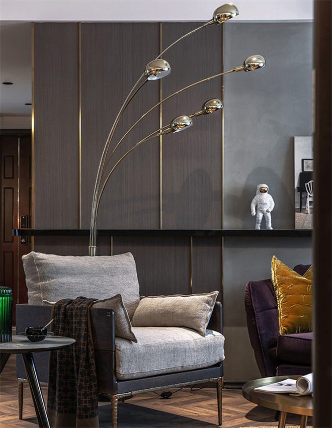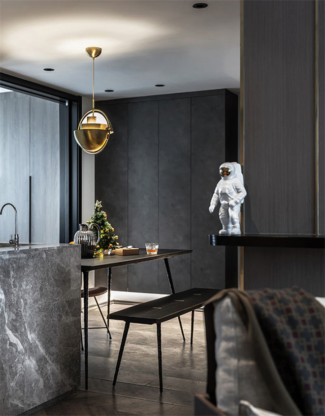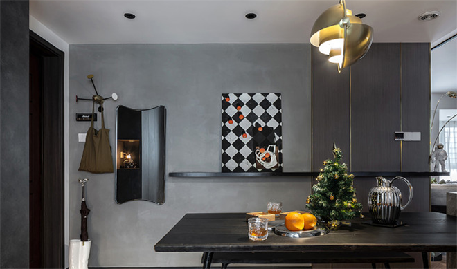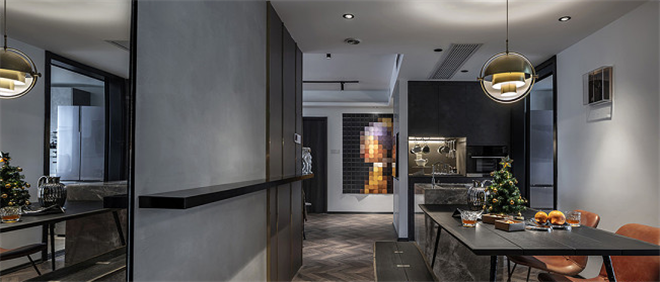 本案大面积使用了灰色系也是有一定的资本的。因为户型光线充足,所以使用深色的工业风暗黑系设计也不会显得压抑。