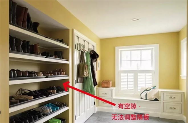 很多朋友家中的鞋柜是请木工师傅照尺寸定制,到使用时发现隔板全部都被固定,无法进行调整,导致无法合理利用空间,结果用了才发现隔板全都固定,很多空间遭浪费。