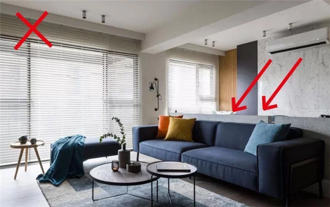 最初在规划时,空调风向建议可朝向墙面,风打到墙面再反射,风力较小,也不会有正面迎风的难受感。但若现在已经定位,无法更动,只好移动沙发位置,避开空调直吹。